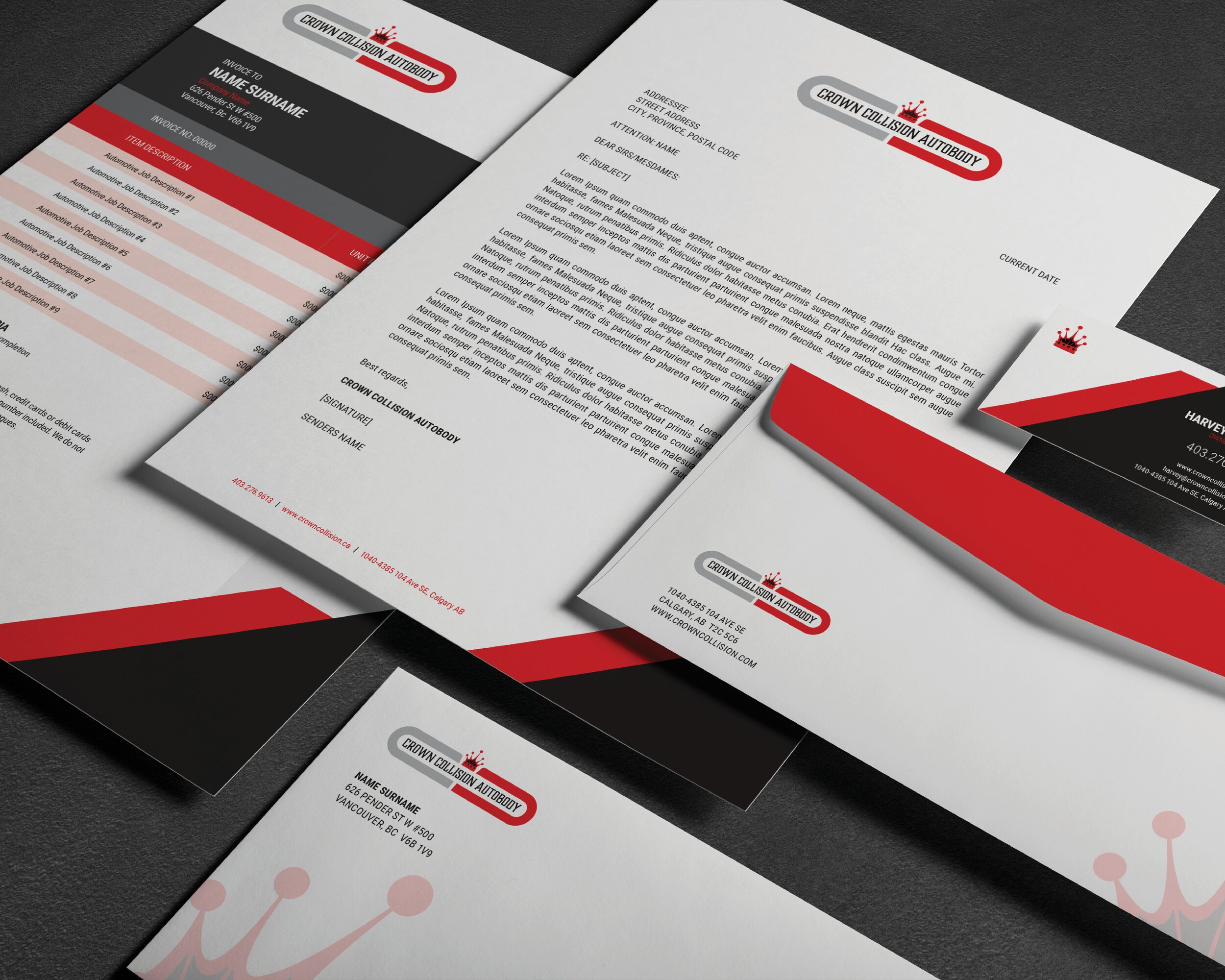 Crown Collision is a small, independent automotive repair shop in Southern Calgary that recently underwent a full rebrand. The owner, originally from the United Kingdom, wanted the new identity to reflect a modern twist on their original branding, incorporating a custom crown into the logomark. The logotype, set in bold Boucherie Block in all caps, exudes confidence and trust, helping build a strong connection with customers. The brand's color palette combines red and grey—red symbolizes high energy and strength, while grey reflects the quality and performance Crown Collision delivers with every repair.